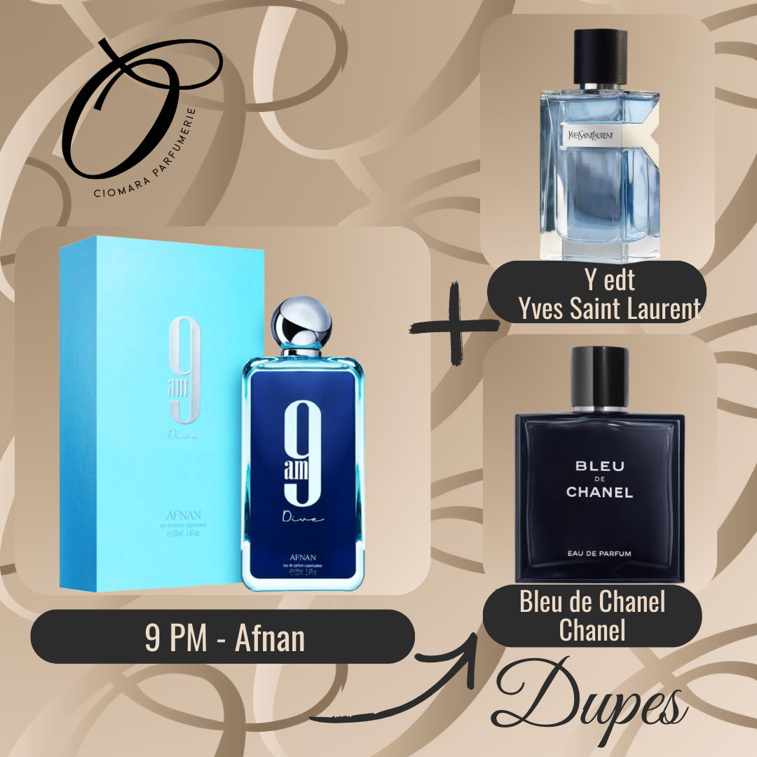 9am Dive de Afnan es una fragancia de la familia olfativa Aromatica Acuatica para Hombres y Mujeres. Las Notas de Salida son menta grosellas negras limon (lima acida) y pimienta rosa las Notas de Corazon son manzana incienso y cedro las Notas de Fondo son jengibre sandalo pachuli y jazmin. Inspirado en Y de Ives Saint Laurent y el Blue de Chanel.