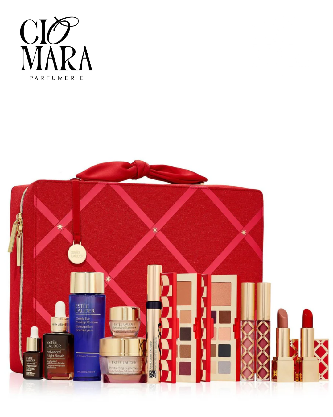 Sérum Advanced Night Repair, y Crema Revitalizing Supreme+, mejorarán tu piel dándote una apariencia juvenil, reduciendo los signos de la edad.Para completar tu rutina de belleza, esta maleta contiene 2 paletas de sombras para crear looks neutros y looks de noche, con rubores para dar color y luminosidad a tus mejillas. Además 2 opciones de labiales y 2 gloss para completar tu look, 1 máscara para unas pestañas largas y definidas y finalmente un desmaquillante que te ayudará a remover tu maquillaje.
